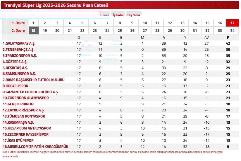 TFF Süper Lig'in 2. devresi 18. haftayla devam edecek. 18. haftanın ilk maçı ise 17 Ocak 2026 günü saat 17.00'de başlayacak olan Başakşehir - Fatih Karagümrük arasında oynanacak.