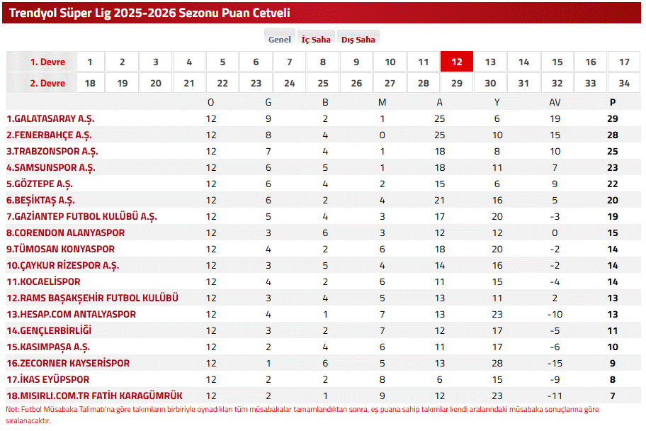 TFF Trendyol Süper Lig'in devam edeceği tarih ve puan durumu ile 13. hafta fikstürü şöyle;