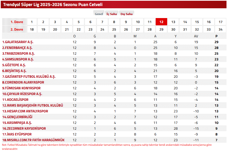 SÜPER LİG PUAN DURUMU