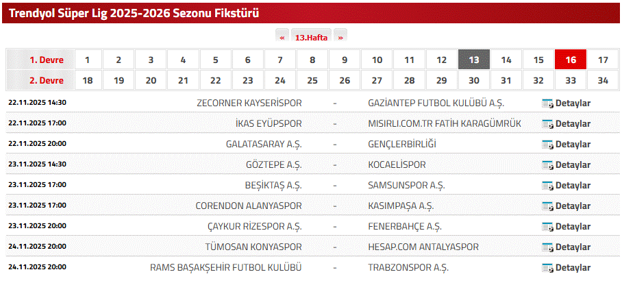SÜPER LİG 13. HAFTA MAÇ PROGRAMI