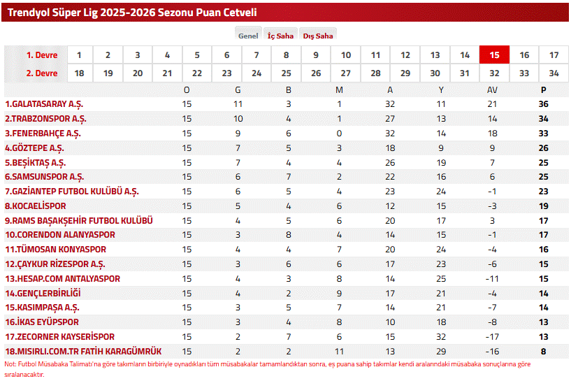 16.Hafta öncesi Süper Lig puan durumu tablosu şöyle;