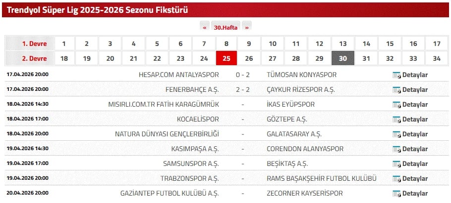 SÜPER LİG 30. HAFTA FİKSTÜRÜ