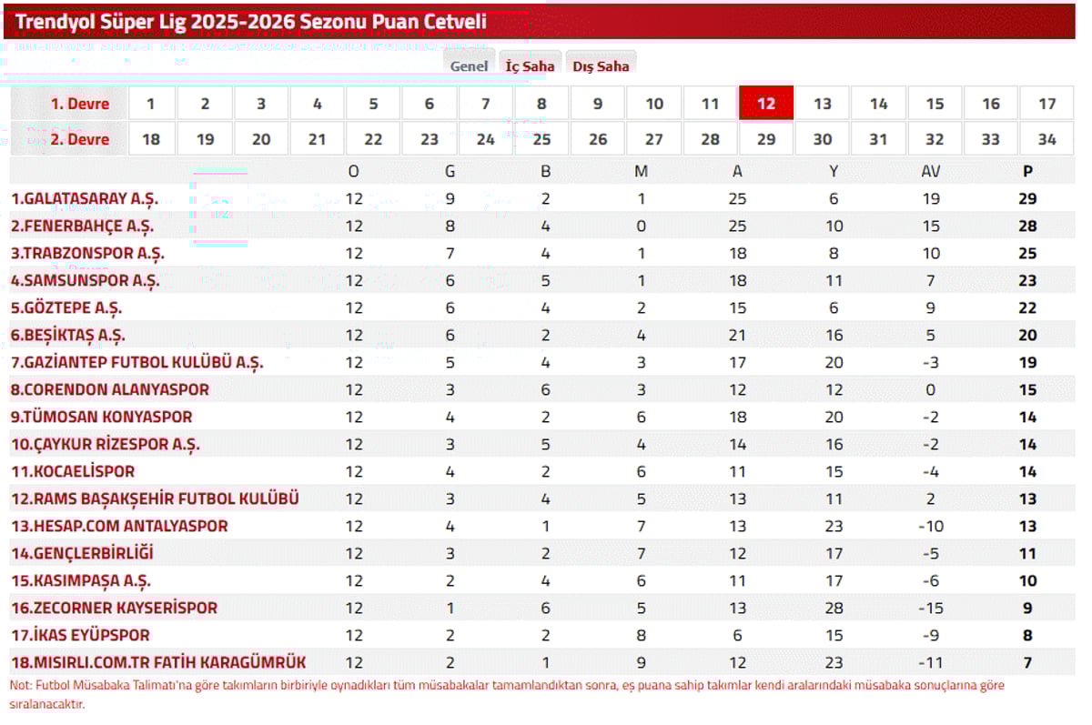 Milli ara öncesi oynanan 12. hafta maçları sonucu şekillenen Süper Lig puan durumu sıralaması şöyle;