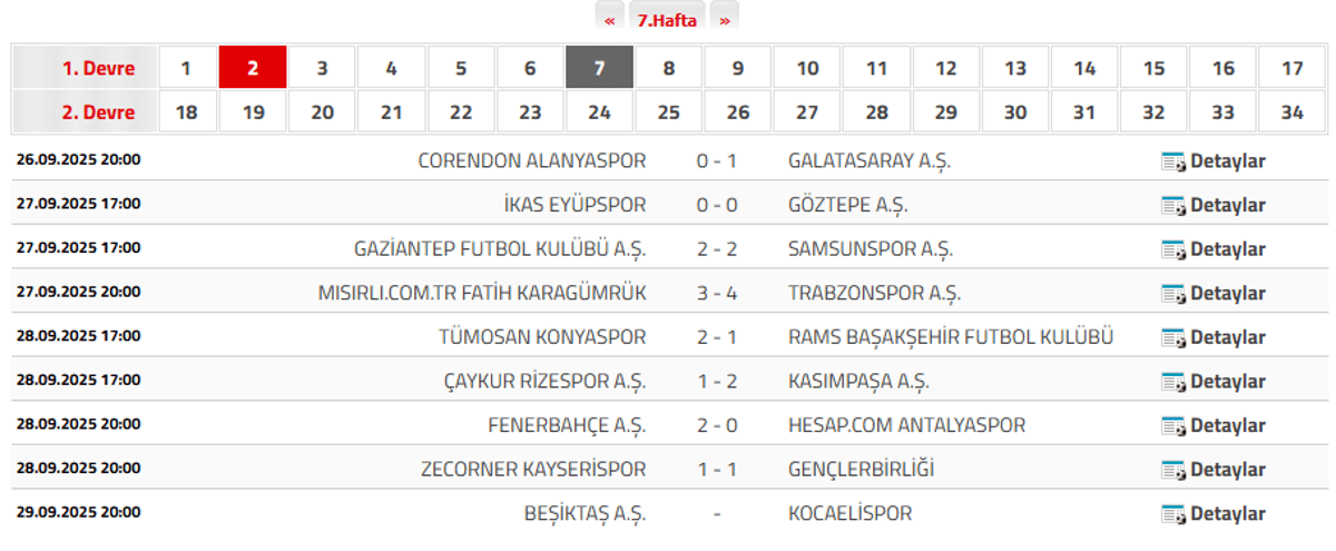 SÜPER LİG 7. HAFTA MAÇ SONUÇLARI