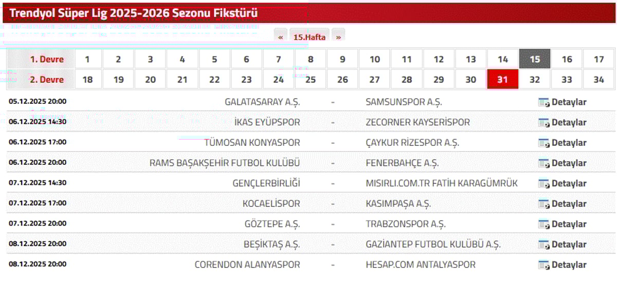 SÜPER LİG 15. HAFTA MAÇ PROGRAMI