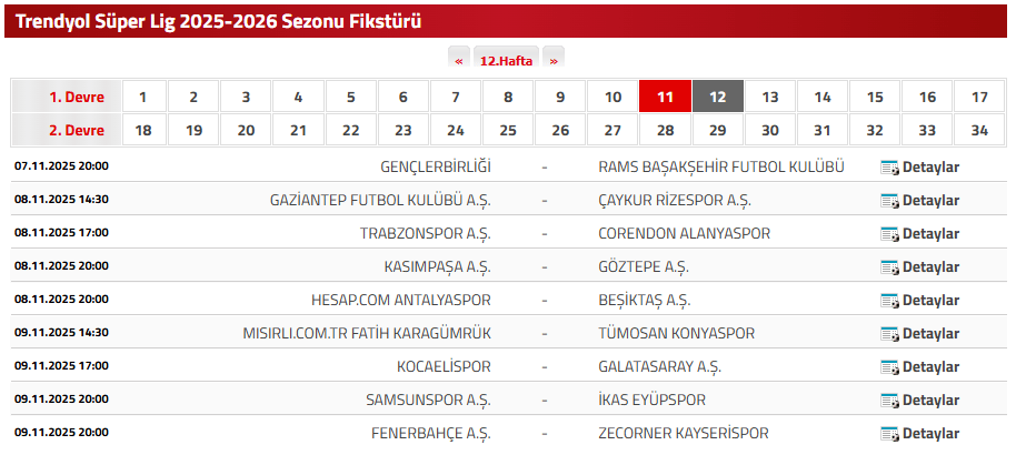 Trendyol Süper Lig'in 12. haftasında oynanacak karşılaşmaların gün ve saat bilgileri şöyle;