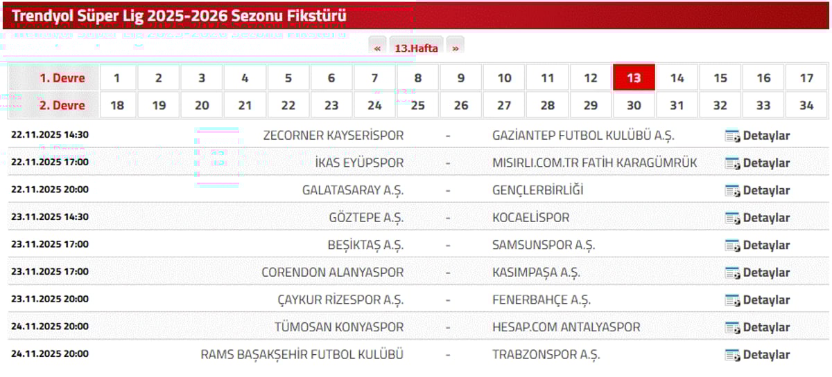 SÜPER LİG 13. HAFTA MAÇ FİKSTÜRÜ