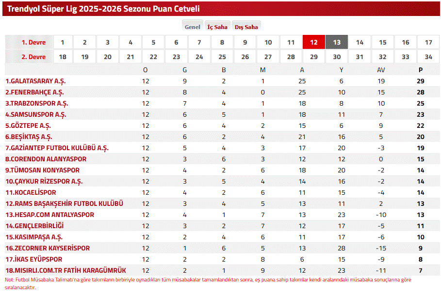 Süper Lig'in 12. haftasında Galatasaray'ın Kocaelispor deplasmanına puan kaybetmesi ve Fenerbahçe'nin Kayserispor karşısında galip gelmesi sonrası güncel puan durumu tablosu futbolseverlerce merak edilerek Süper Lig puan durumu sıralaması tablosu nasıl? sorusuna cevap aranıyor.