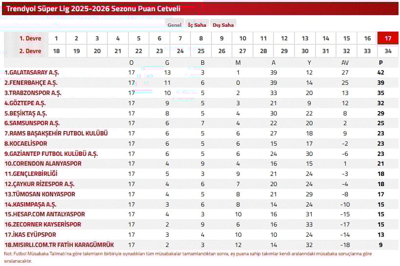 Süper Lig'in 18. haftası başlıyor. Hafta boyunca oynanacak maçları takip etmek isteyenler 17 Ocak Süper Lig puan durumu sıralaması nasıl? sorularına cevap arıyor.