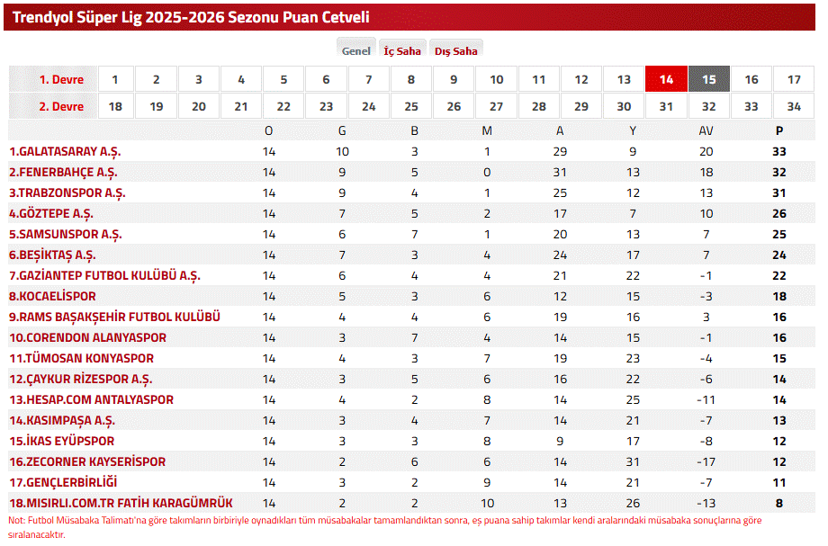 Süper Lig'in 14. haftasının sona ermesi ve dün akşam oynanan Fenerbahçe-Galatasaray derbisi sonrasında güncel Süper Lig puan durumu sıralaması merak edilerek TFF ile 2 Aralık Süper lig puan durumu sıralama tablosu nasıl? sorusuna yanıt aranıyor.