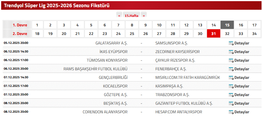 SÜPER LİG 15. HAFTA FİKSTÜRÜ