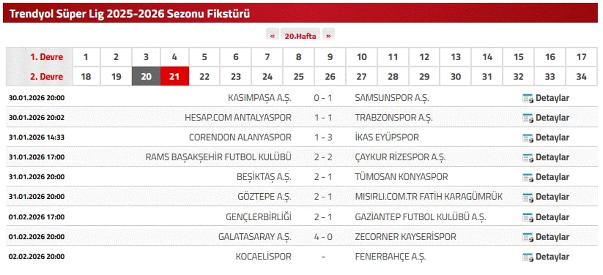 SÜPER LİG 21. HAFTA FİKSTÜRÜ