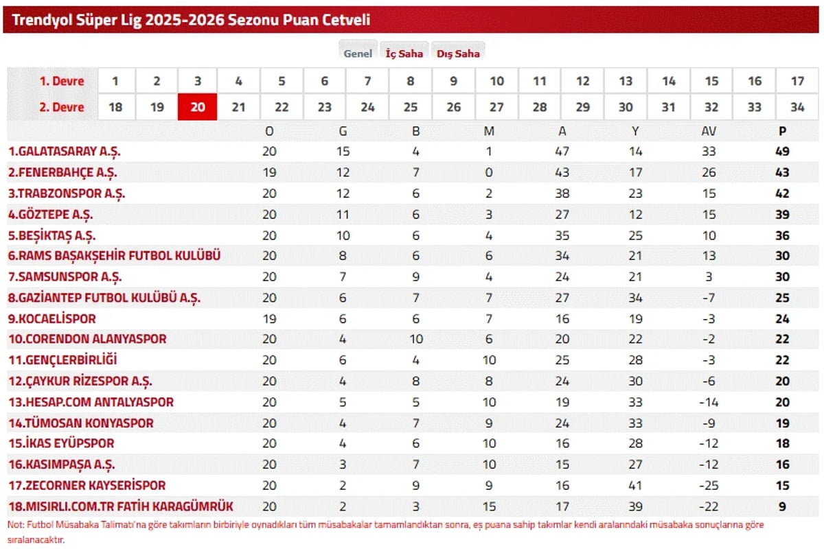 Süper Lig puan durumu | TFF ile 20. hafta Süper Lig puan durumu sıralaması nasıl?