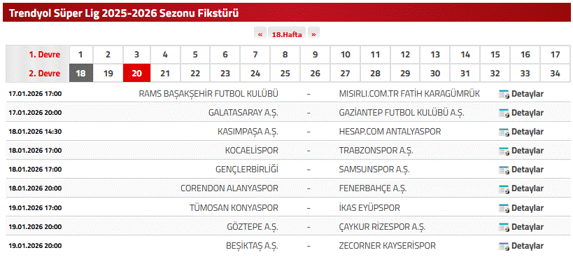 SÜPER LİG 18. HAFTA MAÇ PROGRAMI
