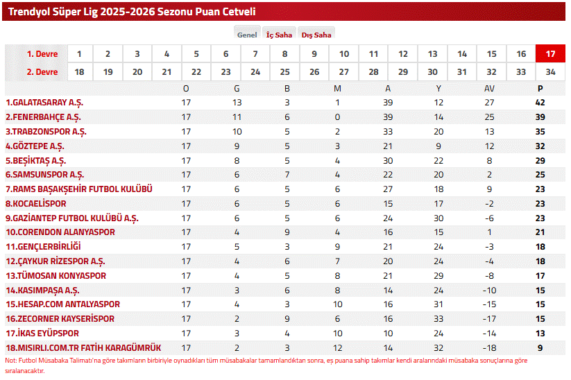 İşte güncel skorlarla puan durumu tablosu ve 18. hafta maç programı detayları şöyle;