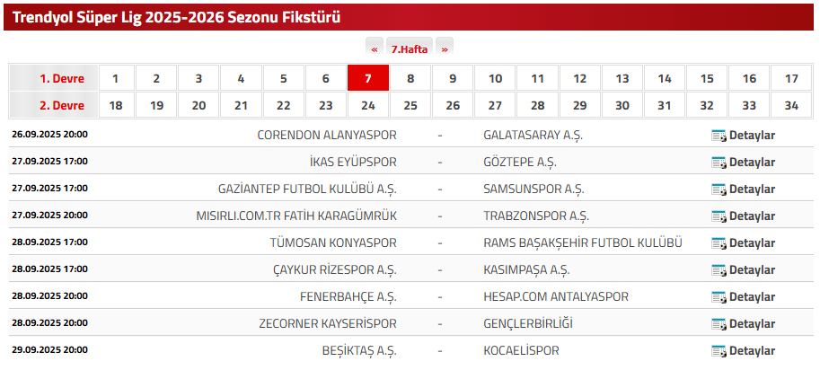 SÜPER LİG 7. HAFTA MAÇ FİKSTÜRÜ