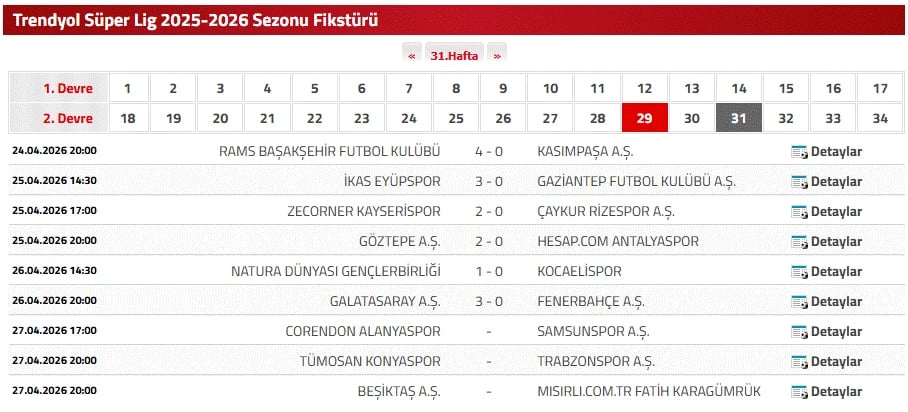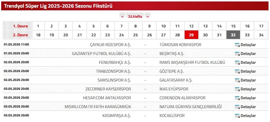 SÜPER LİG 32. HAFTA FİKSTÜRÜ