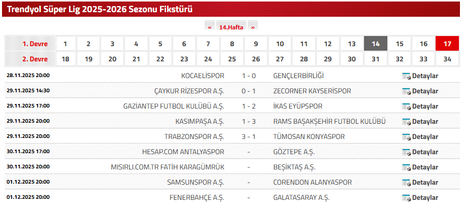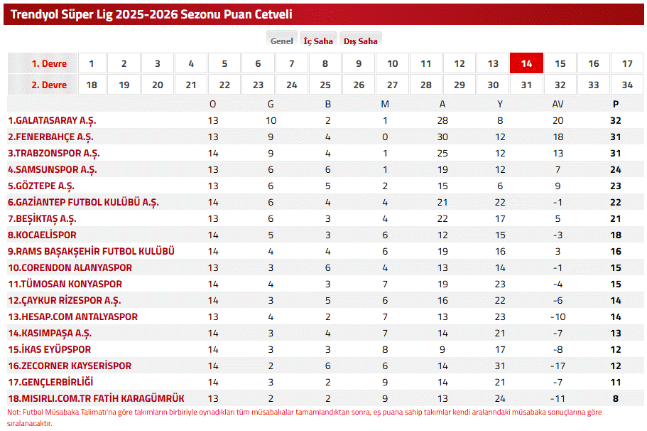 Süper Lig'in 14. haftasında oynanan maçların ardından oluşan puan durumunu ve takım sıralamalarını öğrenmek isteyen futbolseverler TFF ile 30 Kasım Süper Lig puan durumu sıralaması nasıl? sorusuna yanıt arıyor.