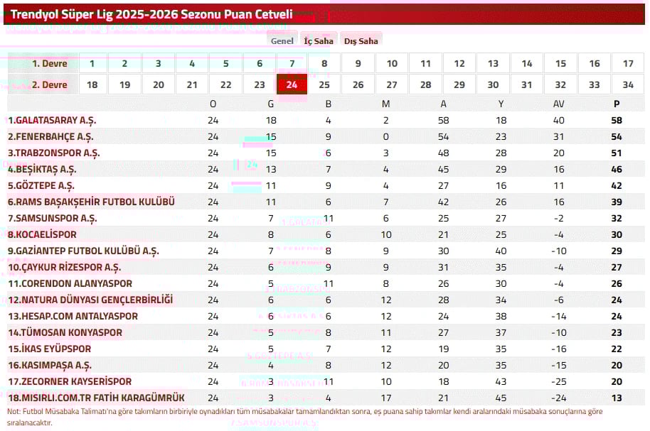 TFF ile güncel Süper Lig puan durumu tablosu ve tüm detaylar şöyle;