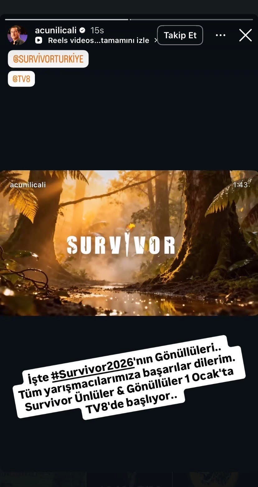 2026 Survivor ünlüler-gönüllüler yarışmasının yapımcısı Acun Ilıcalı kişisel instagram hesabından yaptığı story paylaşımında Survivor 2026'nın 1 Ocak'ta başlayacağını açıkladı.