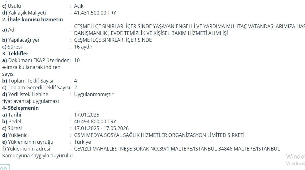 İBB Halkla İlişkiler Müdürlüğü'nden ihale alan GSM Medya'nın Çeşme Belediyesi'nden de ihale aldığı ortaya çıktı. 26 Aralık 2024 tarihinde ''ÇEŞME İLÇE SINIRLARI İÇERİSİNDE YAŞAYAN ENGELLİ VE YARDIMA MUHTAÇ VATANDAŞLARIMIZA HASTA NAKİL,KORUYUCU SAĞLIK DANIŞMANLIK , EVDE TEMİZLİK VE KİŞİSEL BAKIM HİZMETİ ALIMI İŞİ'' başlıklı ihalenin sözleşme bedeli ise 40 milyon 494 bin TL.