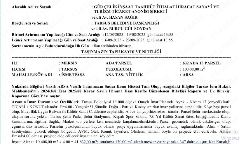 Yapılan icra işlemlerinin ardından, belediyeye ait bir taşınmazın satışına karar verildi. Tarsus İcra Dairesi, belediyenin borcunu ödeyebilmesi için ‘arsa’ vasfındaki taşınmazı 471 milyon TL bedelle açık artırmaya çıkardı.