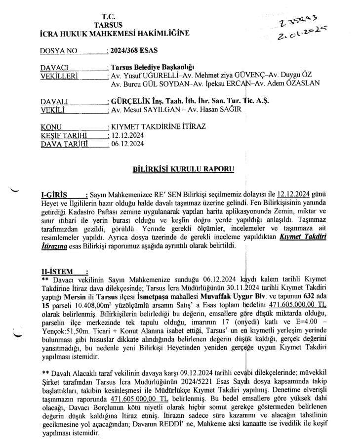 Belediyenin yaptığı itiraz sonrası dosya, Tarsus İcra Hukuk Mahkemesi’ne taşındı. Mahkeme, yeni bir bilirkişi heyeti atayarak arsanın gerçek değerinin tespit edilmesini istedi.