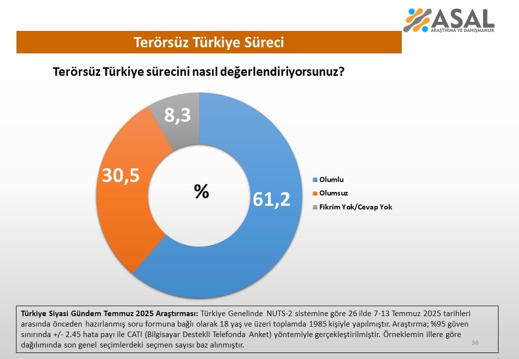 ASAL Araştırma’nın Temmuz 2025’te yaptığı anket, kamuoyunun “Terörsüz Türkiye” sürecine nasıl baktığını ortaya koydu. Ankete katılan her 10 kişiden 6’sı süreci olumlu değerlendirdi.