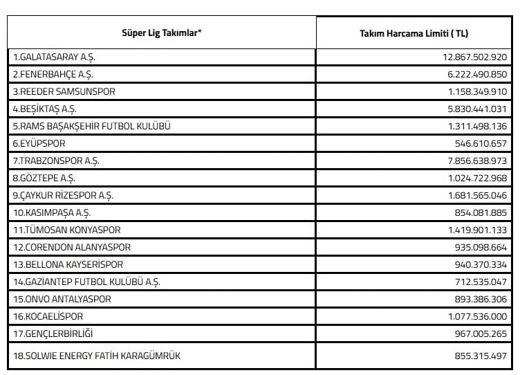 Açıklanan listede en yüksek limit, 12.867.502.920 TL ile Galatasaray A.Ş.'ye verildi. Galatasaray'ı, 7.856.638.973 TL ile Trabzonspor A.Ş. izlerken; Fenerbahçe A.Ş. için 6.222.490.850 TL, Beşiktaş A.Ş. için ise 5.830.441.031 TL harcama limiti tanımlandı. Bu rakamlar, kulüplerin geçmiş dönem gelir-gider dengeleri ve finansal tabloları esas alınarak hesaplandı.