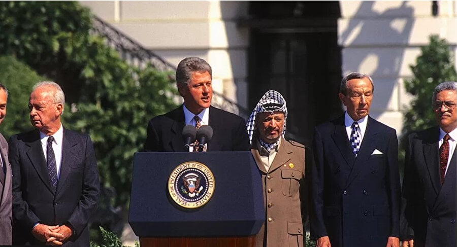 1993'te Filistin Kurtuluş Örgütü (FKÖ) Başkanı Yaser Arafat, İsrail Başbakanı İzak Rabin'e bir mektup yazarak, Filistin halkı adına İsrail'i ve saldırı ve tehditlerden uzak bir şekilde var olma hakkını tanıdığını teyit etti.