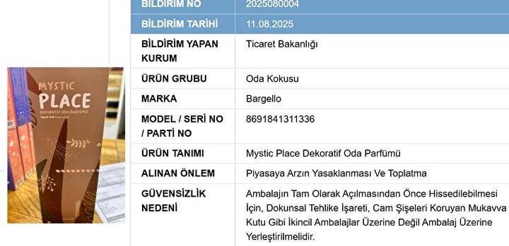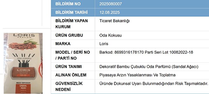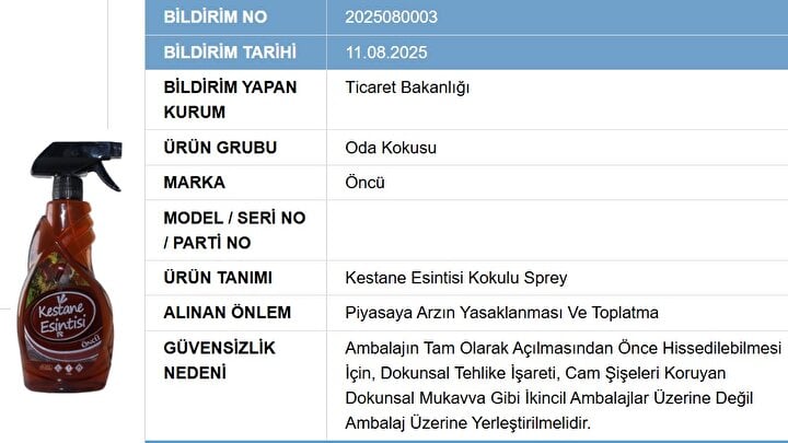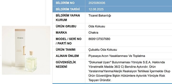 Bakanlık tarafından toplatılan ürünler arasında "Loris Dekarotif Bambu Çubuklu Oda Parfümü" ve "Chakra Çubuklu Oda Kokusu" bulunuyor. Ayrıca "Bargello Mystic Place Dekoratif Oda Parfümü" ve "Öncü Kestane Esintisi Kokulu Sprey" de listede yer alıyor. "Universal Marka - Uni Drain Unlight Lavabo Açıcı" da toplatılan ürünler arasında bulunuyor.