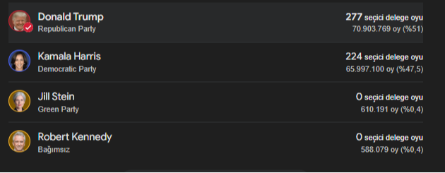 Demokrat Parti adayı Kamala Harris ise 224 delege elde edebildi. Seçim sonucunun kesinleşmesi için adaylardan birinin 270 delegeye ulaşması gerekiyor.