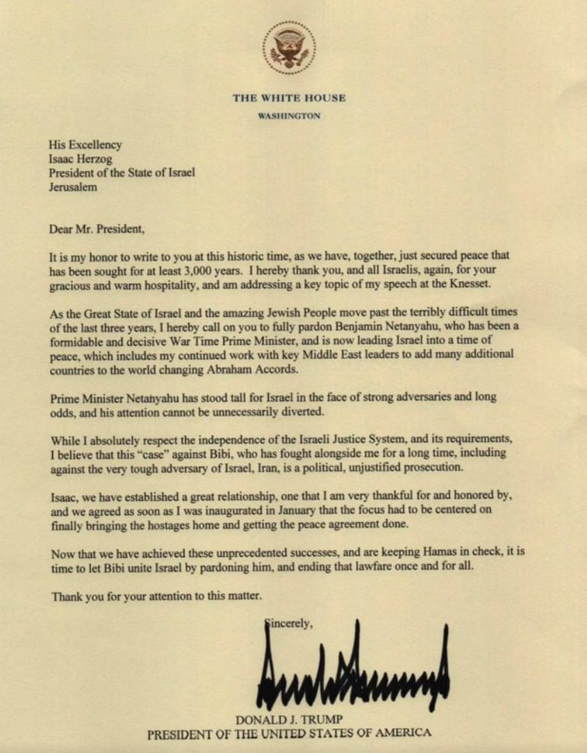 ABD Başkanı Donald Trump, İsrail Cumhurbaşkanı Isaac Herzog’a gönderdiği mektupta, yolsuzluk davalarından yargılanan Başbakan Binyamin Netanyahu’nun affedilmesini talep etti.