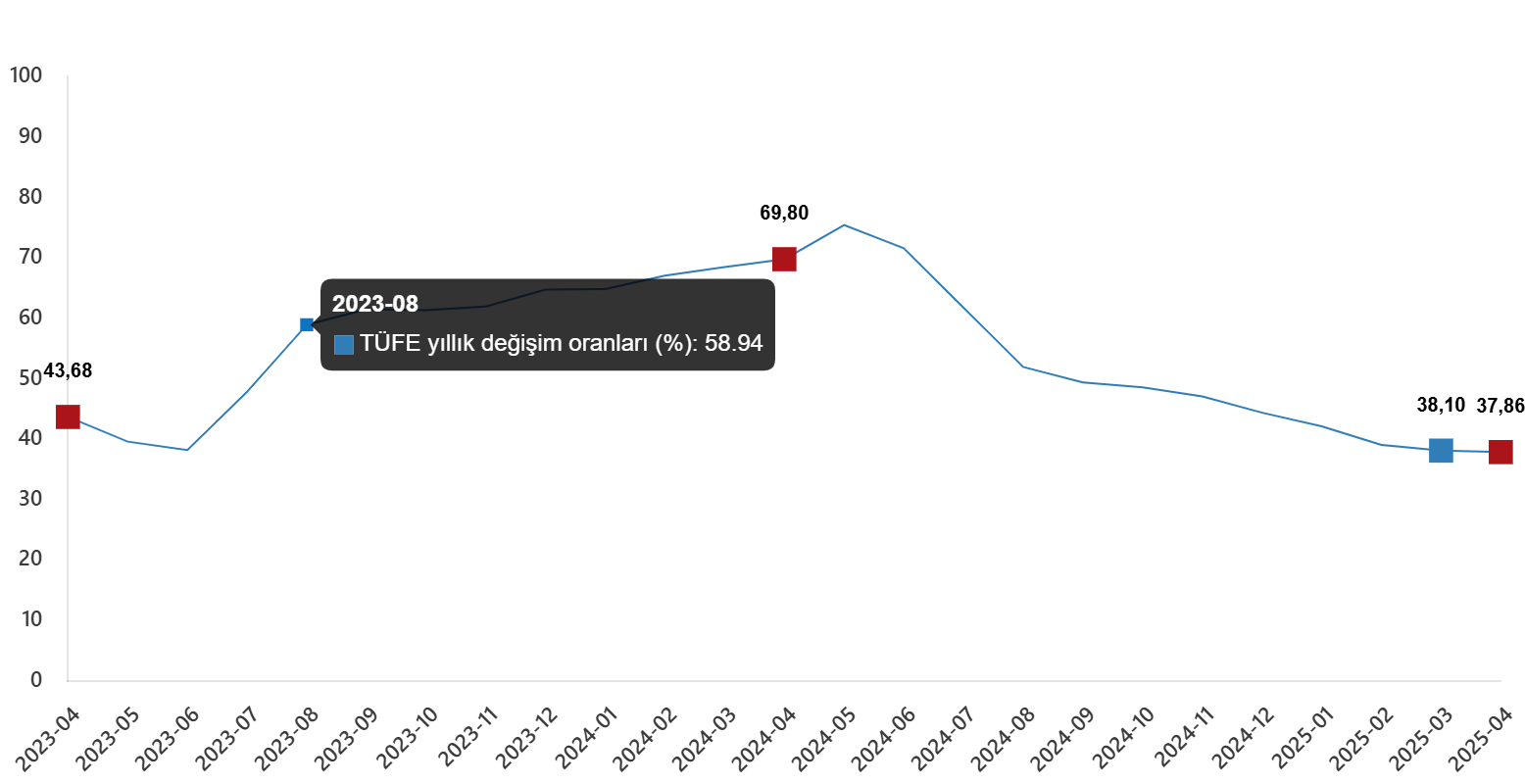 - Yıllık enflasyon, nisan ayı itibarıyla yüzde 37,86 olarak kaydedildi.