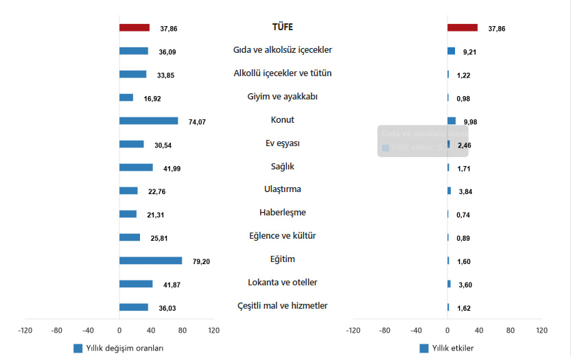 En yüksek ağırlığa sahip 3 ana harcama grubunun yıllık değişimleri; gıda ve alkolsüz içeceklerde %36,09 artış, ulaştırmada %22,76 artış ve konutta %74,07 artış olarak gerçekleşti. İlgili ana grupların yıllık değişime olan etkileri ise gıda ve alkolsüz içeceklerde %9,21, ulaştırmada %3,84 ve konutta %9,98 oldu.
