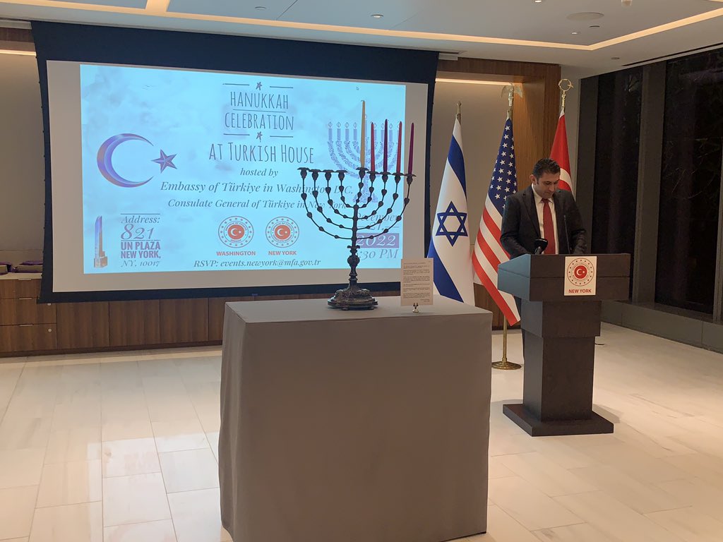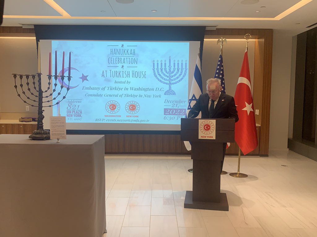 Türkiye'nin New York Başkonsolosu Reyhan Özgür de kutlamanın Türk ve Yahudi halkları arasında büyüyen dostluğun bir başka kanıtı olduğuna değinerek, "Türkevi'nin kapıları Musevi dostlarımıza her zaman sonuna kadar açıktır. Bugünkü Hanuka kutlaması ve Türkevi'nde ilk defa menora mumlarının yakılması tarihi bir olaydır." dedi.