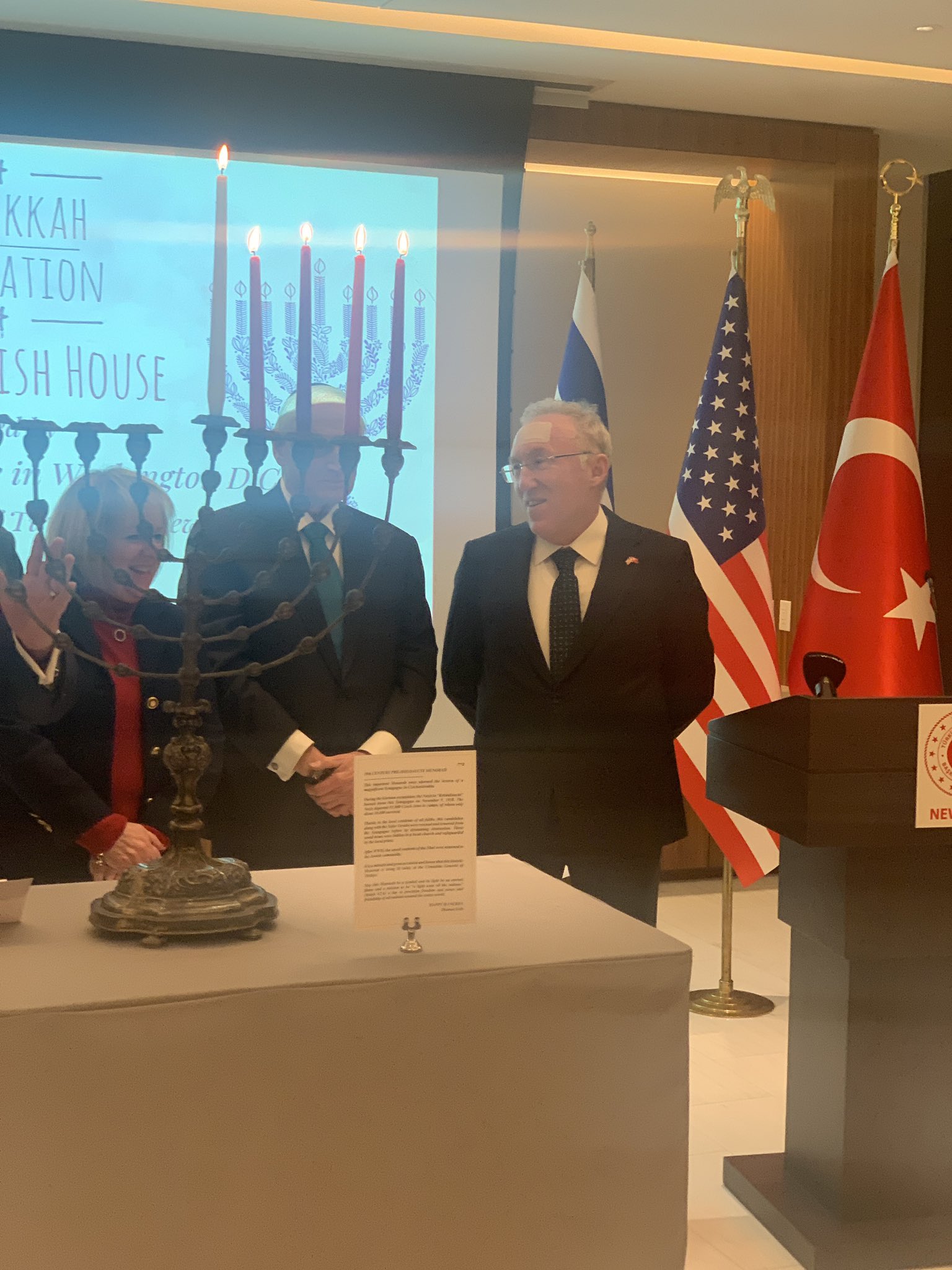 Türkiye'nin Washington Büyükelçiliği ile New York Türk Konsolosluğunun ev sahipliğinde Hanuka'yı kutlamak için düzenlenen törende, Yahudi cemaati üyeleri 19. yüzyıldan kalma, menora diye isimlendirilen şamdanı kullandı.