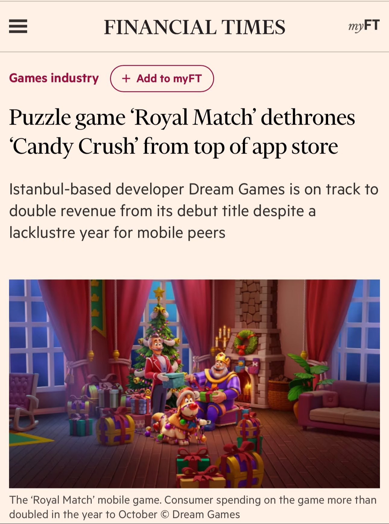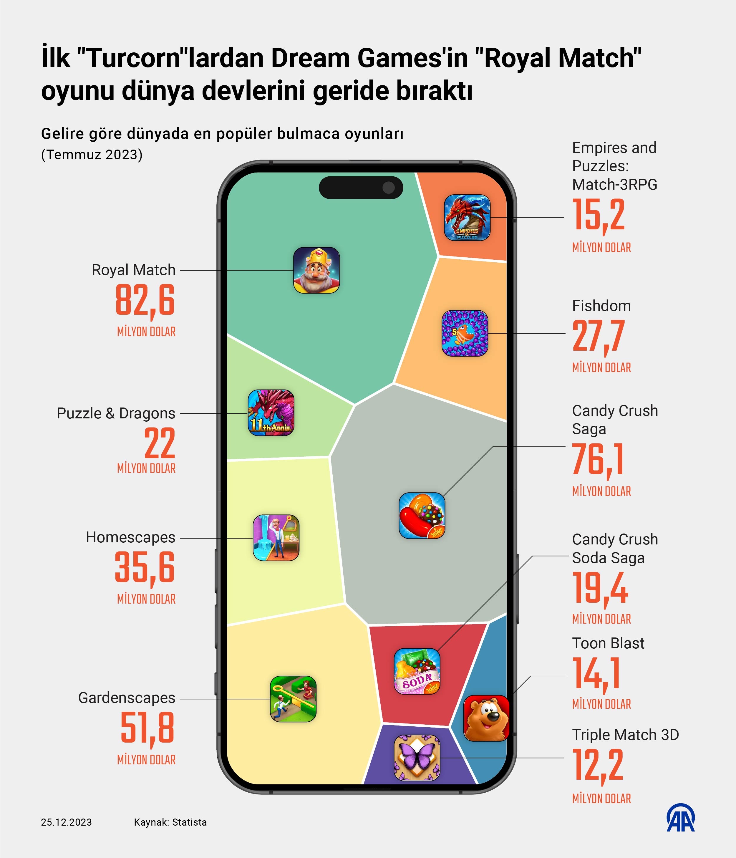 Türkiye oyun dünyasında önde gelen ülke haline gelirken Türk şirketlerinin başarısı konuşulmaya devam ediyor. İstanbul merkezli Dream Games tarafından geliştirilen bir mobil oyun olan Royal Match, Microsoft'un efsane oyunu Candy Crush'u tahtından indirdi. Royal Match, mobil dünyasında en çok gelir elde eden oyun haline geldi.