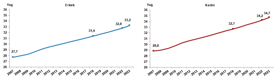 Türkiye'de 2022 yılında 33,5 olan ortanca yaş, 2023 yılında 34'e yükseldi. Cinsiyete göre incelendiğinde, ortanca yaşın erkeklerde 32,8'den 33,2'ye, kadınlarda ise 34,2'den 34,7'ye yükseldiği görüldü.