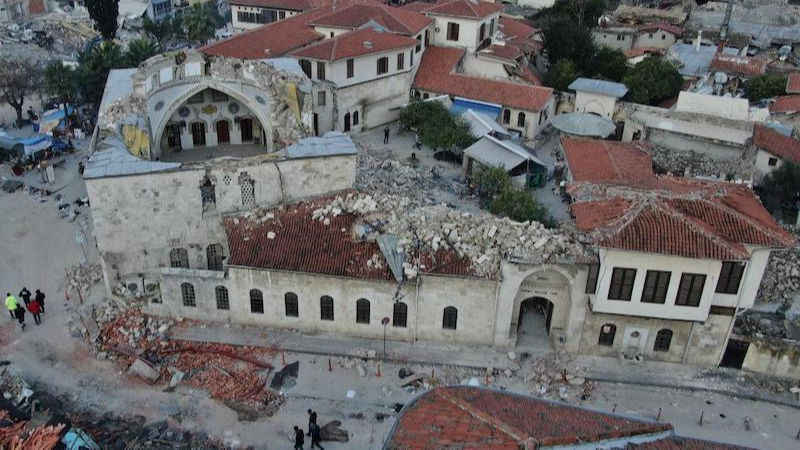7. yüzyıla dayanan ve avlusunda da 19. yüzyılda inşa edilen bir şadırvan olan caminin havadan çekilen görüntüleri, tarihi caminin enkazını gösteriyor. 14 asırlık caminin yakınında yer alan tarihi Yeni Hamam da depremde hasar gördü.