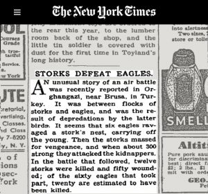 1934 yılının Haziran ayının ilk günlerinde Bursa'da sıradışı bir savaş başladı. Uludağ'dan ovaya doğru inen 6 kartal, Bursa'nın Orhangazi ilçesindeki bir leylek yuvasına saldırdı. İşlerini bitirdiklerinde anne ve baba leylekleri öldürüp 4 tane yavru leyleği de yanlarında götürdüler. Bu olayın üzerinden 3 gün geçmişti ki başka bir grup kartal yine Orhangazi'de başka bir leylek yuvasına saldırdı fakat kendilerini bir sürpriz bekliyordu. Saldırıyı bir şekilde öğrendiklerini tahmin edilen leylekler yavrularını yuvadan kaçırıp saklamıştı.
