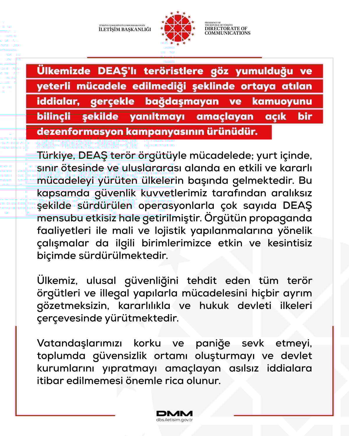 DMM tarafından sosyal medya platformu X üzerinden yapılan açıklamada, "Ülkemizde DEAŞ'lı teröristlere göz yumulduğu" yönündeki söylemlerin bilinçli bir karalama faaliyeti olduğu ifade edildi. Bu tür iddiaların temel amacının, toplumda bir güvensizlik ortamı yaratarak vatandaşları korku ve paniğe sevk etmek olduğu belirtildi.