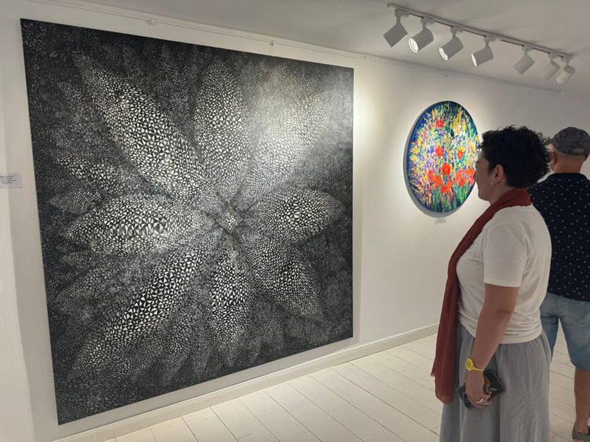 Bozcaada Sanat Galerisi’nde açılan sergide, “yok oluş”, “var oluş” ve “rejenerasyon” kavramları, gökkuşağı tonları ve mistik sembollerle zenginleştirilmiş soyut geometrik düzenlemelerle işleniyor.