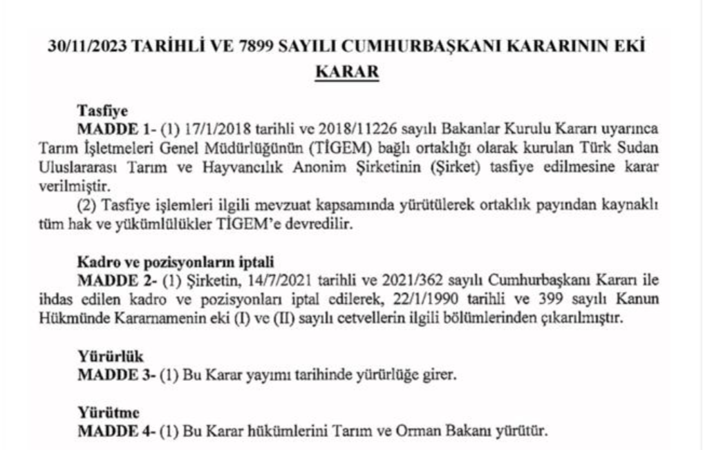 Resmi Gazete’de yayınlanan Karar ile Türk Sudan Uluslararası Tarım ve Hayvancılık şirketindeki kadro ve pozisyonlar da iptal edildi. Karar’da özetle şu bilgilere yer verildi: “Bakanlar Kurulu Kararı uyarınca Tarım İşletmeleri Genel Müdürlüğünün (TÎGEM) bağlı ortaklığı olarak kurulan Türk Sudan Uluslararası Tarım ve Hayvancılık Anonim Şirketinin (Şirket) tasfiye edilmesine karar verilmiştir.