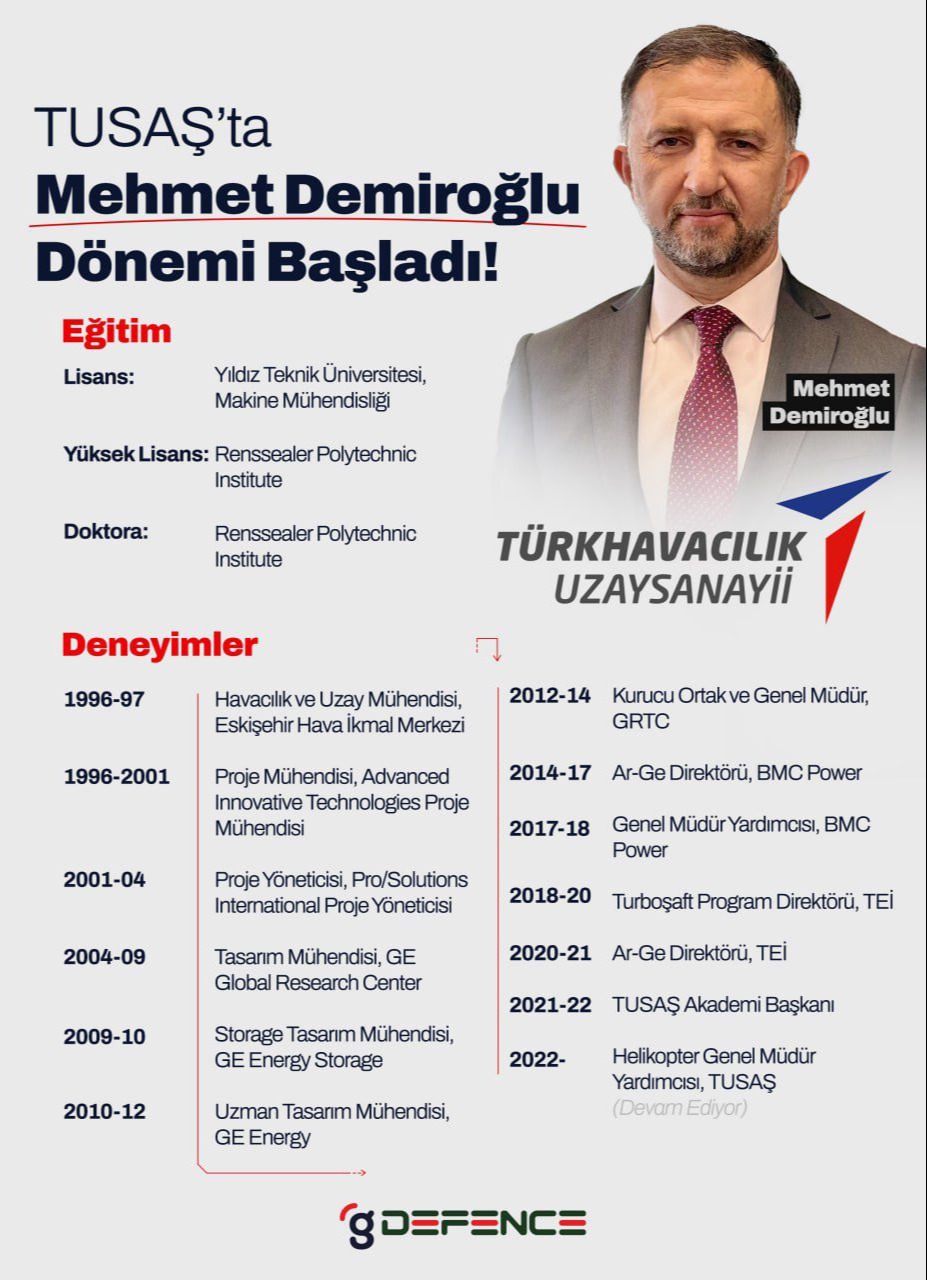 TUSAŞ Genel Müdürü Temel Kotil'in yerine ise TUSAŞ'ta Helikopter Genel Müdür Yardımcısı olarak görev yapan Mehmet Demiroğlu getirildi.