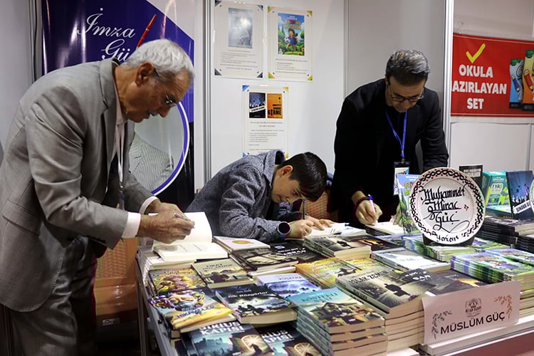 - Elazığ Belediyesince düzenlenen ve 30 Kasım'a kadar sürecek olan 6. Kitap Fuarı'nda, emekli öğretmen Müslüm Güç (72), oğlu Serkan Güç (46) ve torunu Muhammed Miraç Güç (10) aynı stantta kitaplarını imzalıyor.