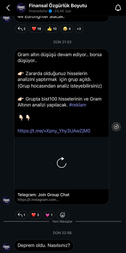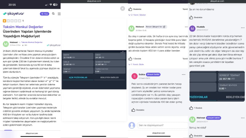 “Taksim Menkul Kıymetler” adıyla açılan başka bir Telegram kanalında da benzer mağduriyetlerin yaşandığı öne sürülüyor.