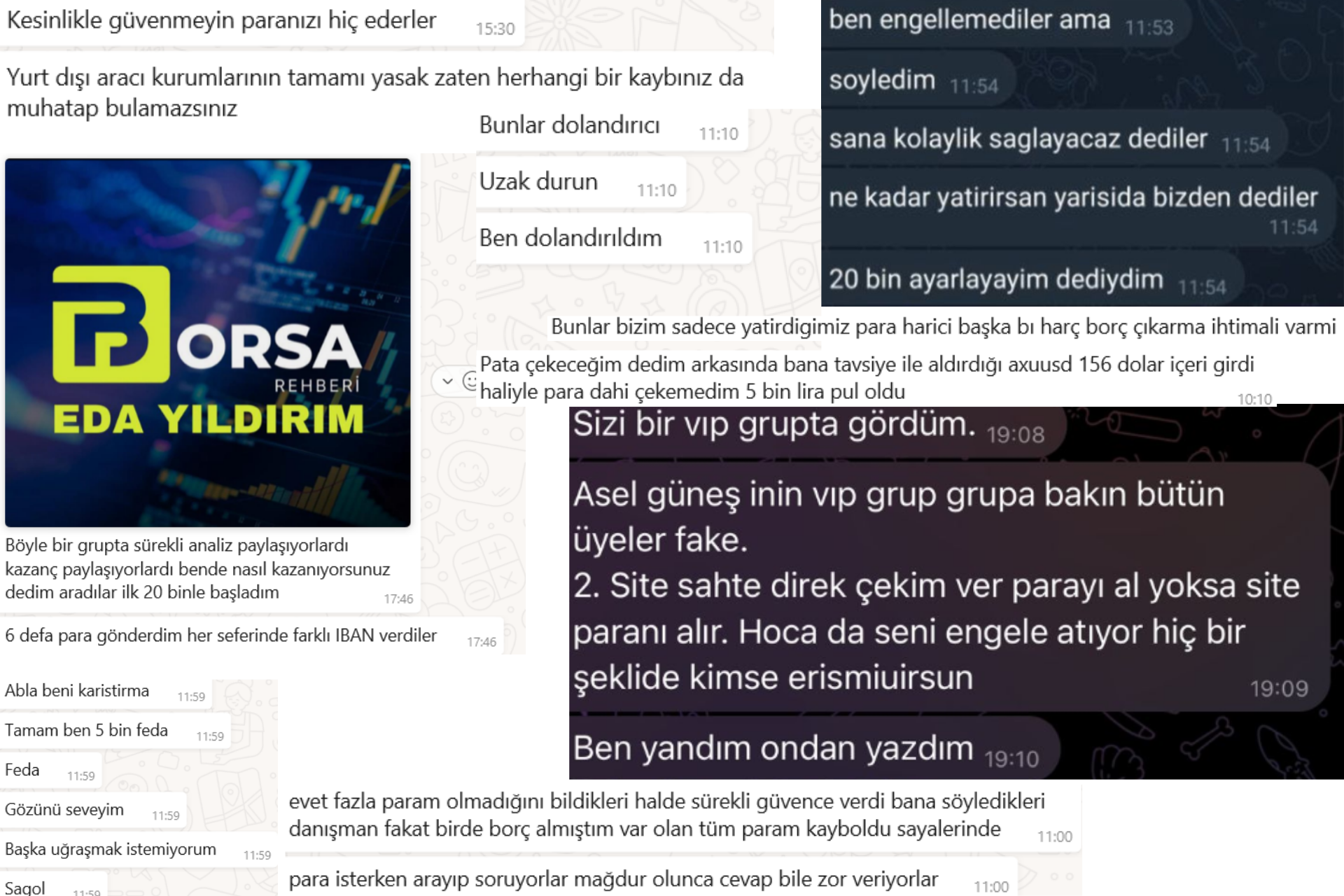 Linke tıklayarak gruplara ulaşan mağdurlar, karşılarında kendisini “Yatırım Uzmanı” olarak tanıtan isimleri (ör. Mert Karakaş, Asel Güneş, Eda Yıldırım, Kaan Duman) görüyor ve doğal olarak bu kişilerin, linki paylaşan popüler Instagram sayfasının sahibi olduğunu zannediyor.