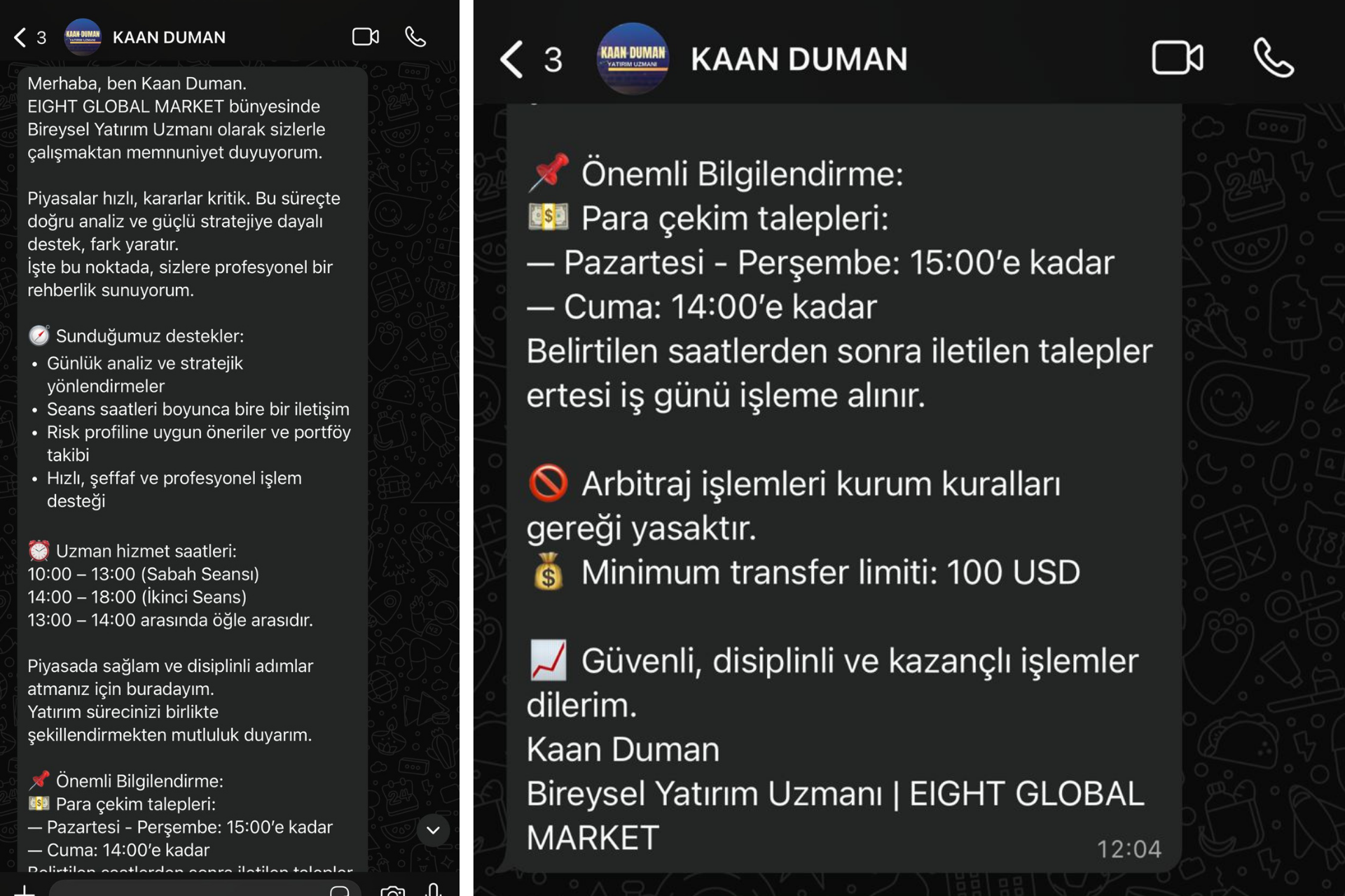 Şebekenin en kritik taktiği, Kıbrıs merkezli lisanslı yatırım şirketi EightCap’in kimliğini çalmak. Mağdurlara gönderilen sahte bağlantılar, şirketin resmi sitesinin birebir kopyası gibi görünen ancak küçük harf oyunu ve yazım hatasıyla hazırlanmış sahte adreslere yönlendiriyor; böylece kullanıcılar gerçeği ayırt edemeyip giriş yapıyor veya para gönderiyor.