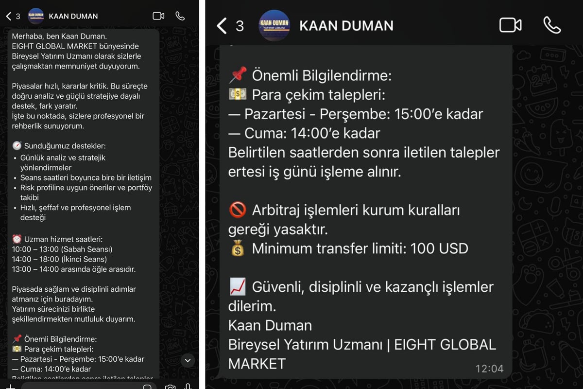 gdh’a ulaşan mağdur ifadeleri, şebekenin EightCap isimli uluslararası firmanın kimliğini çalıp arayüzünü kopyalayarak benzer yöntemleri farklı isimler ve Telegram grupları altında sürdürdüğünü öne sürüyor.